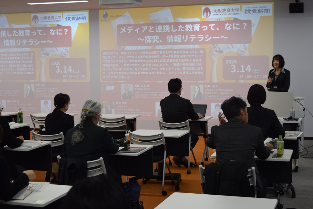 大阪教育大と読売新聞大阪本社は3月14日、「メディアと連携した教育って、なに?~探究、情報リテラシー~」をテーマにした「みらい教育セミナー」を、大教大天王寺キャンパスで開きました。参加した約40人は、農と食の体験プログラム「探Qみらいファーム」で本社と協業する大阪公立大を加えた三者の取り組みに、熱心に耳を傾けました。